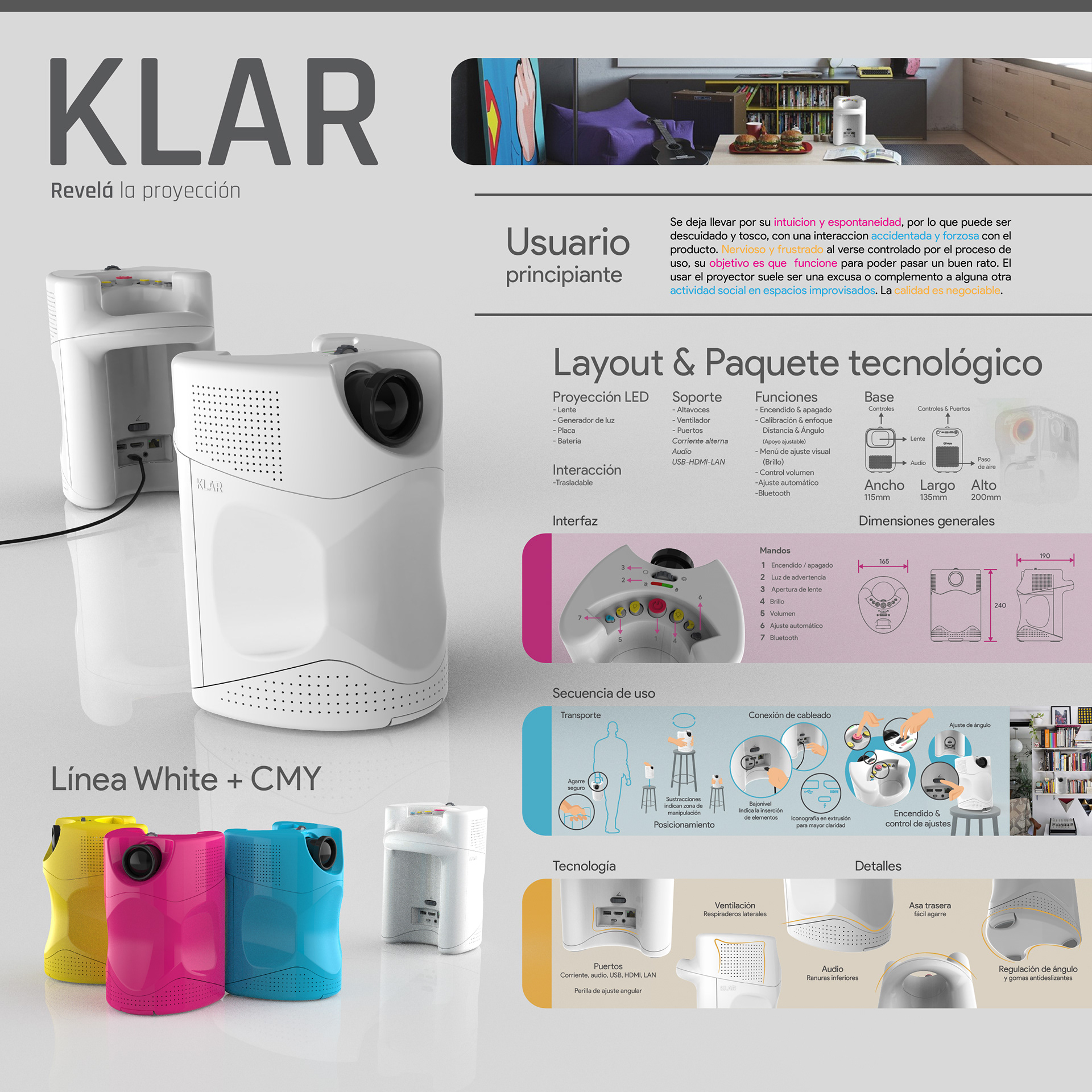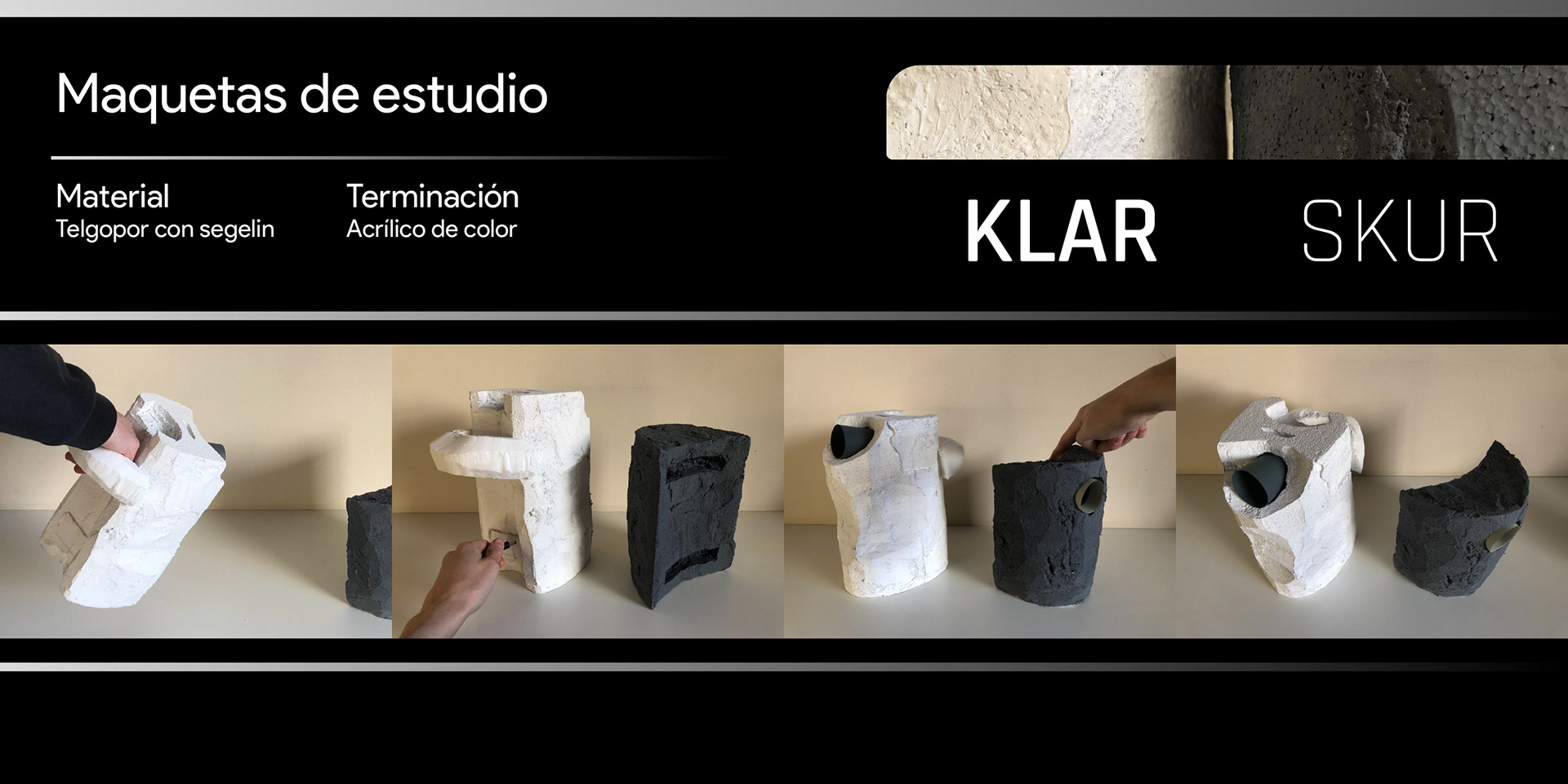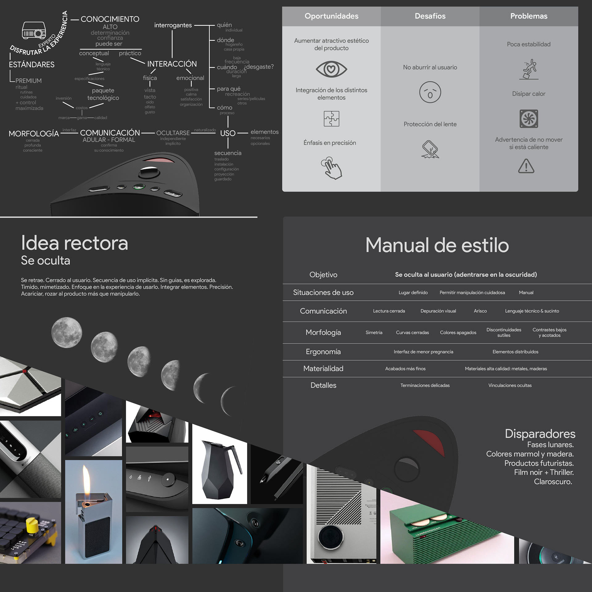 KLAR: Named after "Claro", the Spanish for Clear/Bright; is a video and image projector targeted towards inexperienced. Inspired by the phases of the moon, it seeks to reveal itself to the user in order to make its use easy and straight-forward. SKUR: Acting as a foil to Klar, Skur (Whose name comes from Oscuro, Dark in Spanish) is a video and image projector meant for expert users, where the interface, like a waning moon, hides itself from the operator.