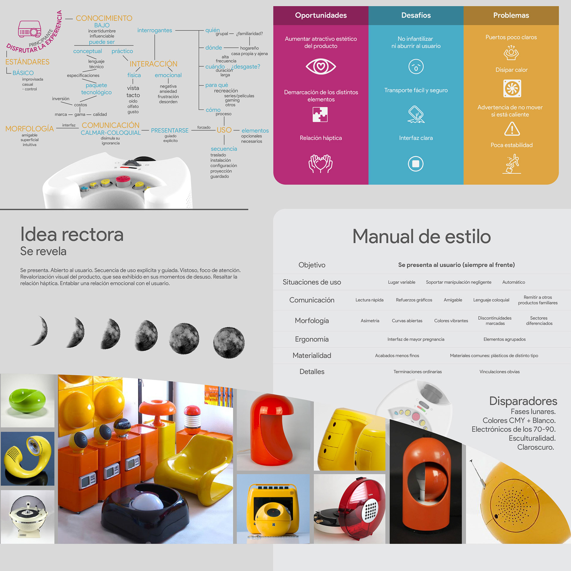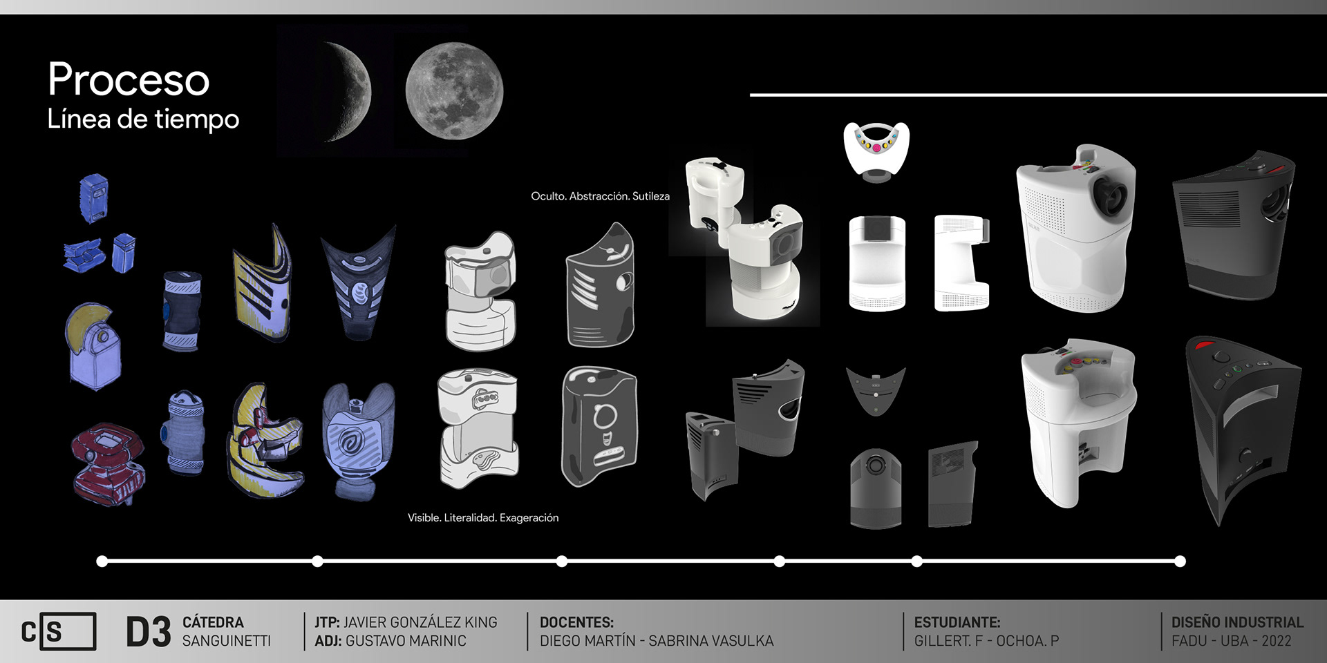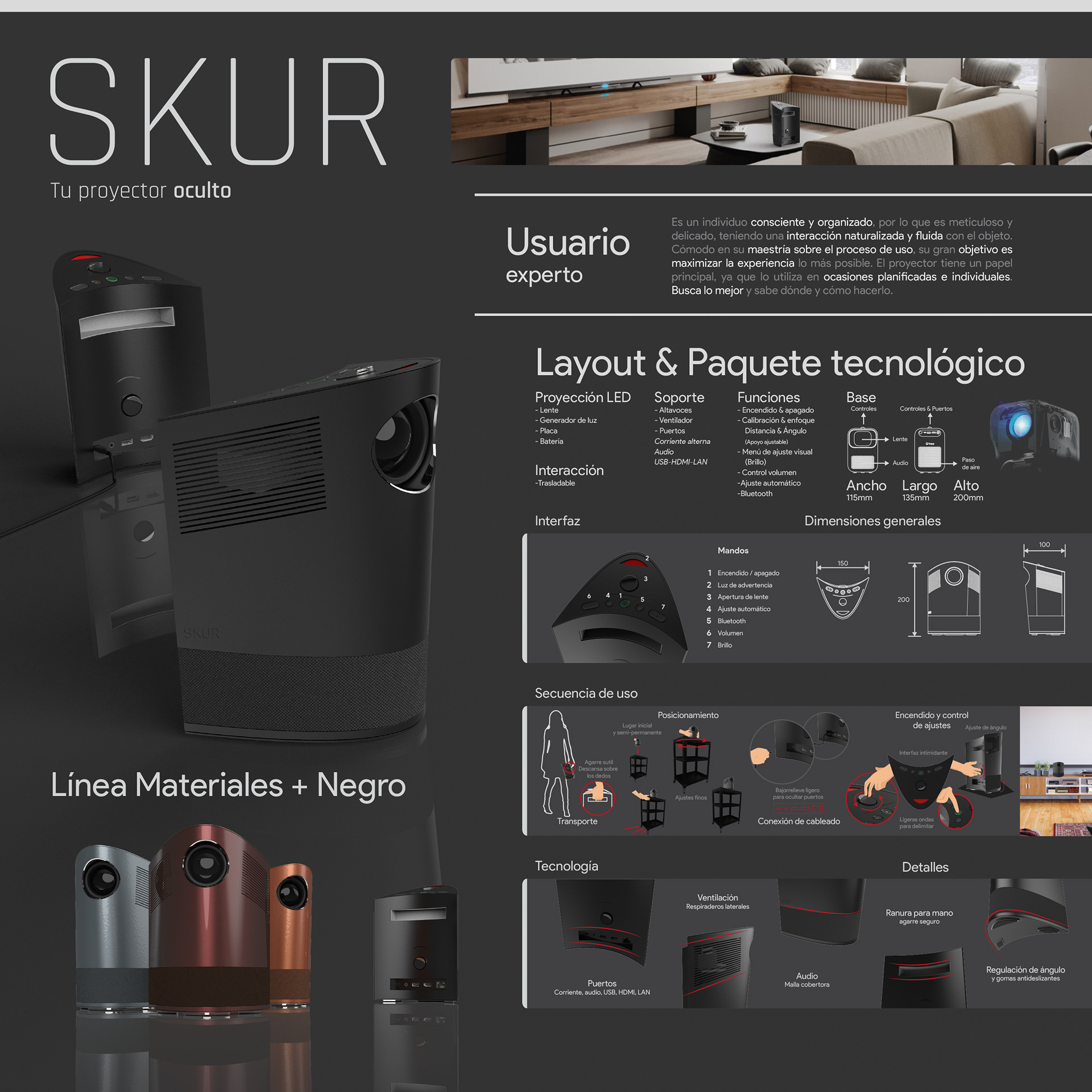 KLAR: Named after "Claro", the Spanish for Clear/Bright; is a video and image projector targeted towards inexperienced. Inspired by the phases of the moon, it seeks to reveal itself to the user in order to make its use easy and straight-forward. SKUR: Acting as a foil to Klar, Skur (Whose name comes from Oscuro, Dark in Spanish) is a video and image projector meant for expert users, where the interface, like a waning moon, hides itself from the operator.